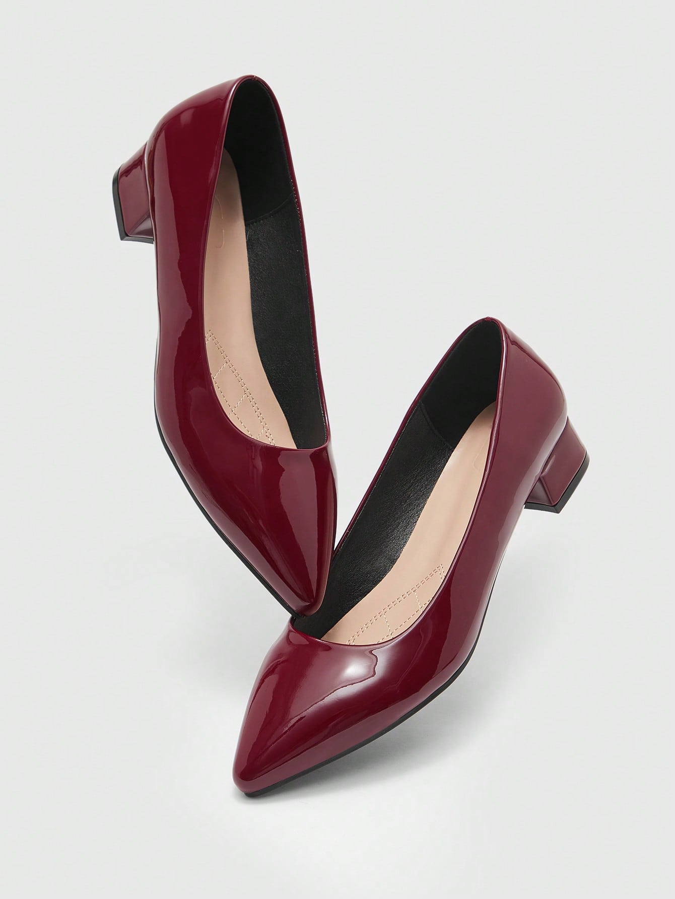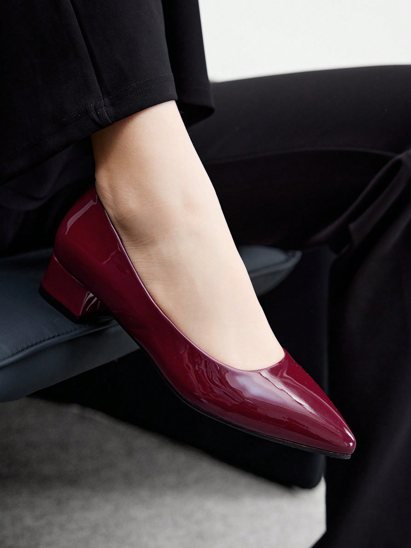 Women's Burgundy Patent Leather Pointed Toe Low Block Heel Pumps Elegant Party Wedding & Office Work Dress Shoes