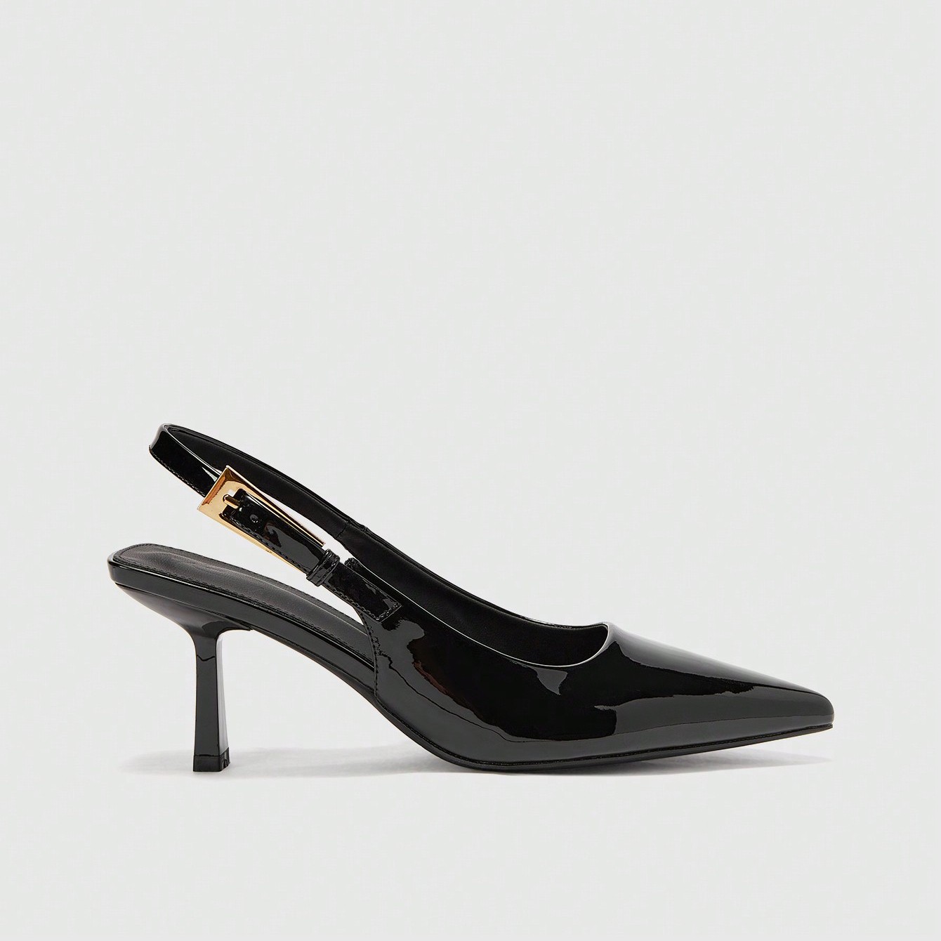Elegant Black Patent Slingback Heels for Women Pointed Toe Gold Buckle Wedding Guest & Party One-Strap Stiletto Slingback Sandals